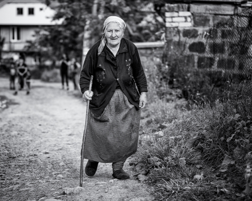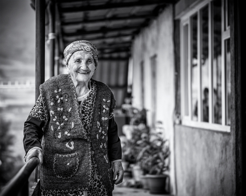 Peši pokračujeme hore dedinou, bavíme sa s domácimi, fotíme. Na priedomí jedného s domov zbadám babičku ako z rozprávky. So širokým úsmevom mi ide v ústrety, ja ju zdraviac fotím. Za ňou letí dcéra a s krikom ju zaháňa do vnútra. Nerozumiem, ale našťastie mám v pätách Vigena a tak sa obraciam o pomoc. Nie, nie je problém s fotením, len babička sa musí prezliecť do niečoho reprezentatívnejšieho, prekladá Vigen. No čo už … kým sa babička prezlieka, ideme do domu. Moderný nábytok, LCD telka s uhlopriečkou cez 100cm, modré neónky na stene – domáci pracujú a žijú v Moskve a teraz prišli domov, lebo babička ochorela.