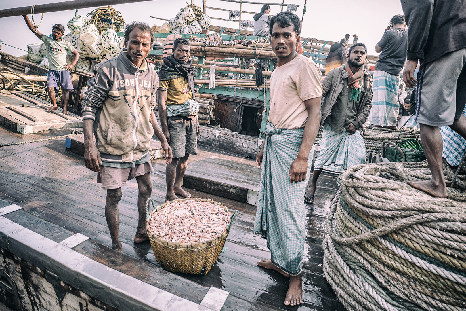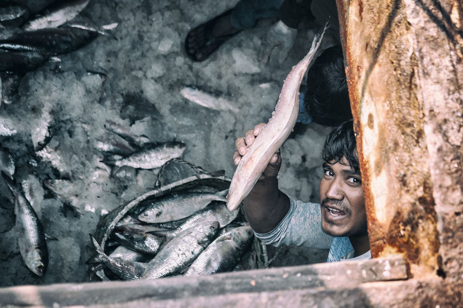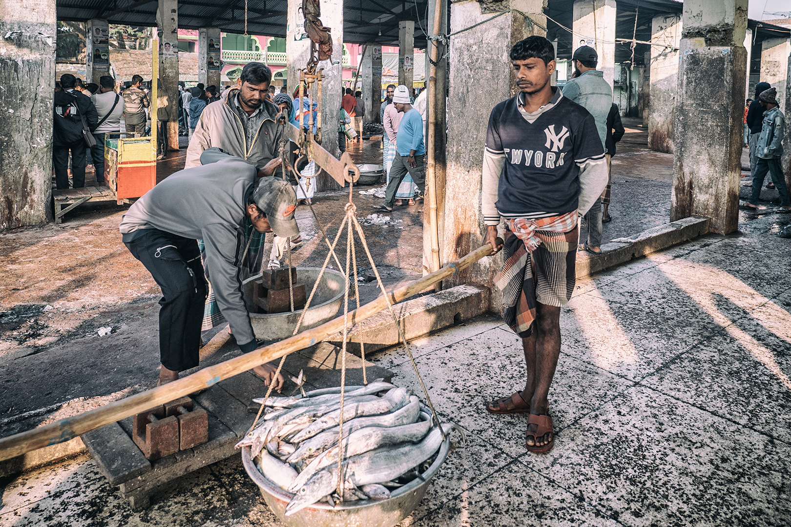 Zavčasu zrána kotvia na rybom trhu rybárske lode všetkých rozmerov. Priviazané jedna o druhú vydávajú svoj náklad. Nosiči kmitajú v hektickom tempe z lodí na triediace plošiny. Odtiaľ na váhy a ďalej k obchodníkom. Všetko sa musí stihnúť veľmi rýchlo. V lodiach sú lode uložené na ľade a je potrebné ich dodať odberateľom skôr, ako sa do nich oprie doobedňajšie slnko, ktoré sa aj teraz v zime postará o teploty 20-20 stupňov.