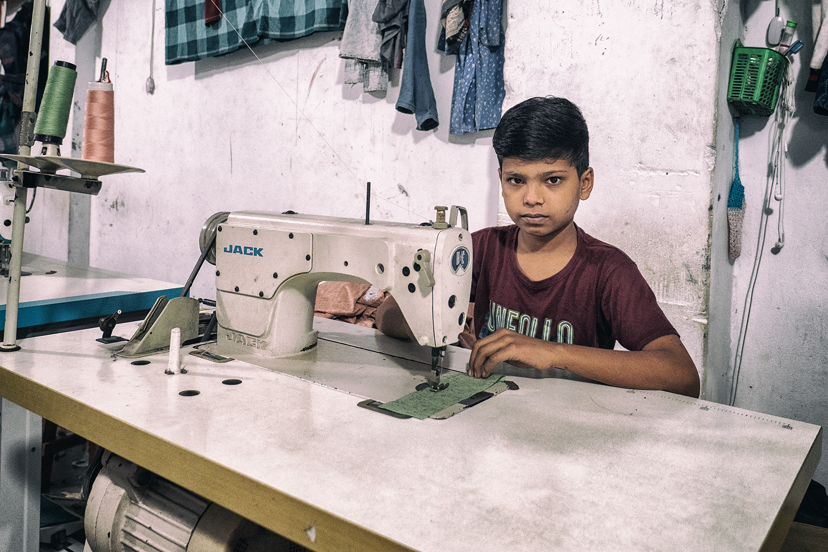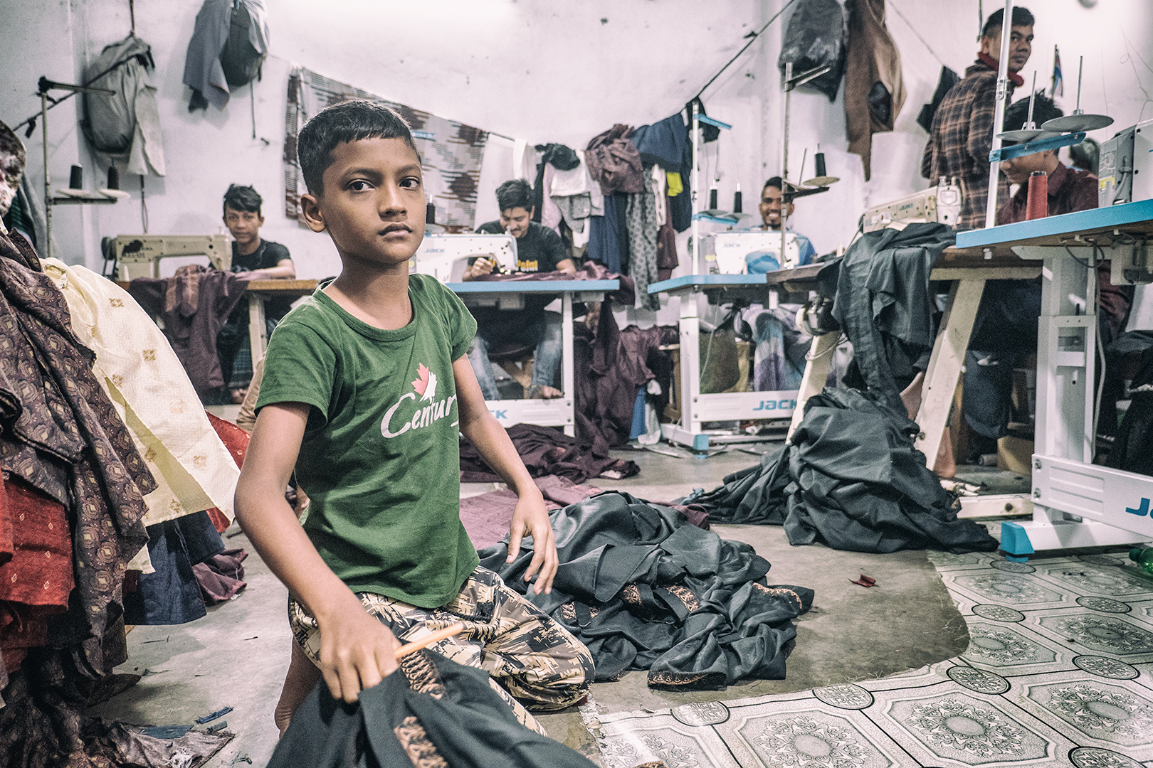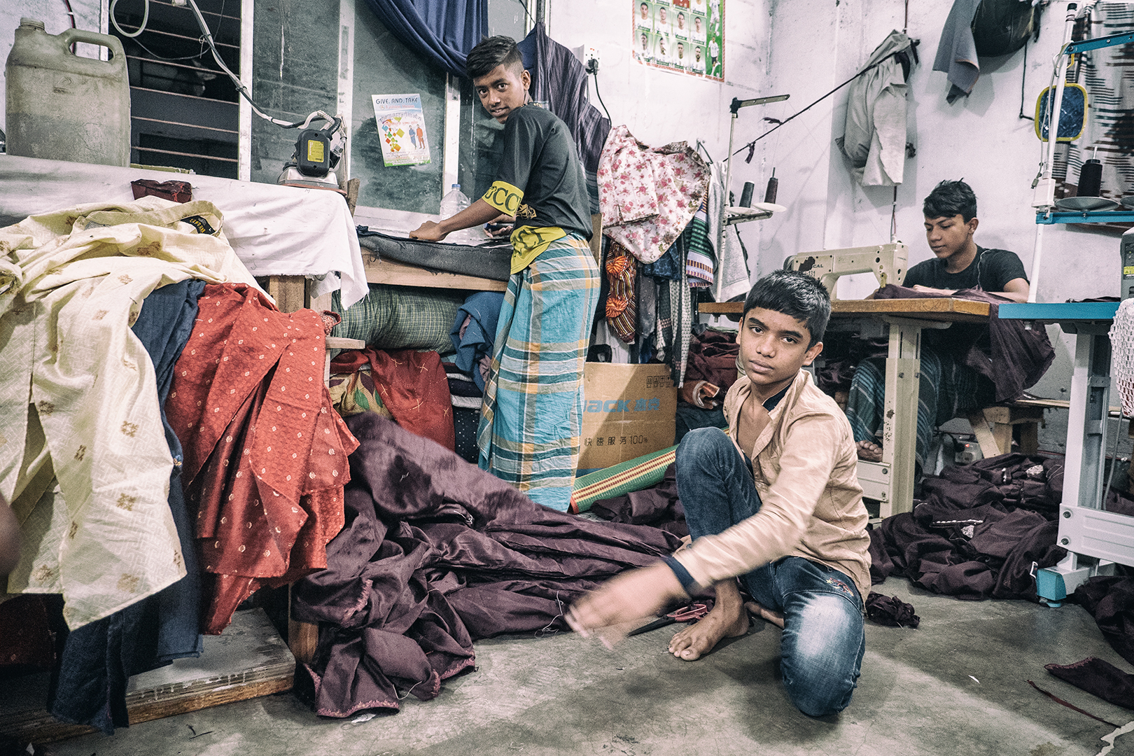 Vyrážame teda hore po schodoch. Na prvom poschodí sú predajne. Na druhom sa odevy balia. Na treťom … nakukujem do prvých dverí. Násťročný chlapci za šijacími strojmi. Odpájam sa od skupiny. Oldřiška a Viktor rovnako. Fotíme, chlapci neprotestujú. Presúvame sa do ďalšej miestnosti. Tu ešte podaktorí spia. Iní sa venujú rannej hygiene.