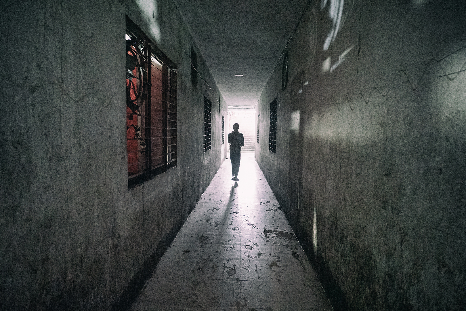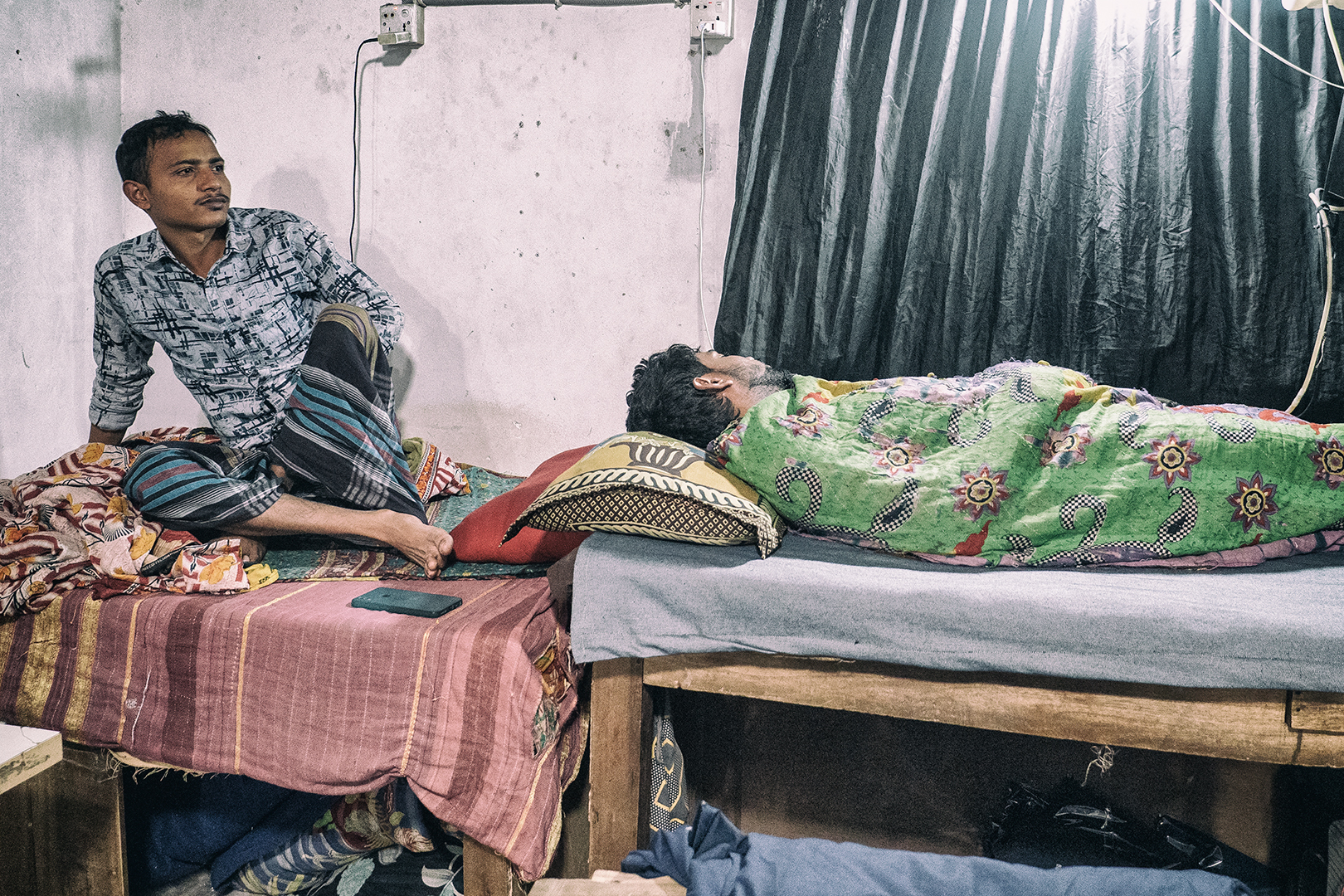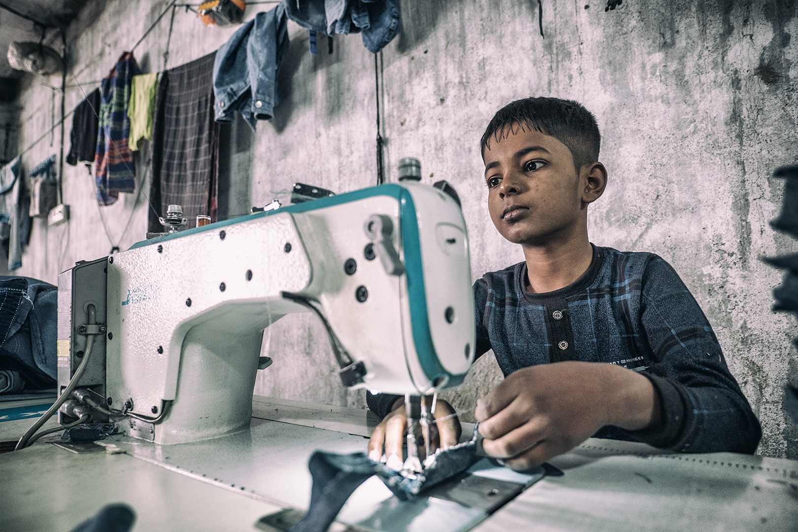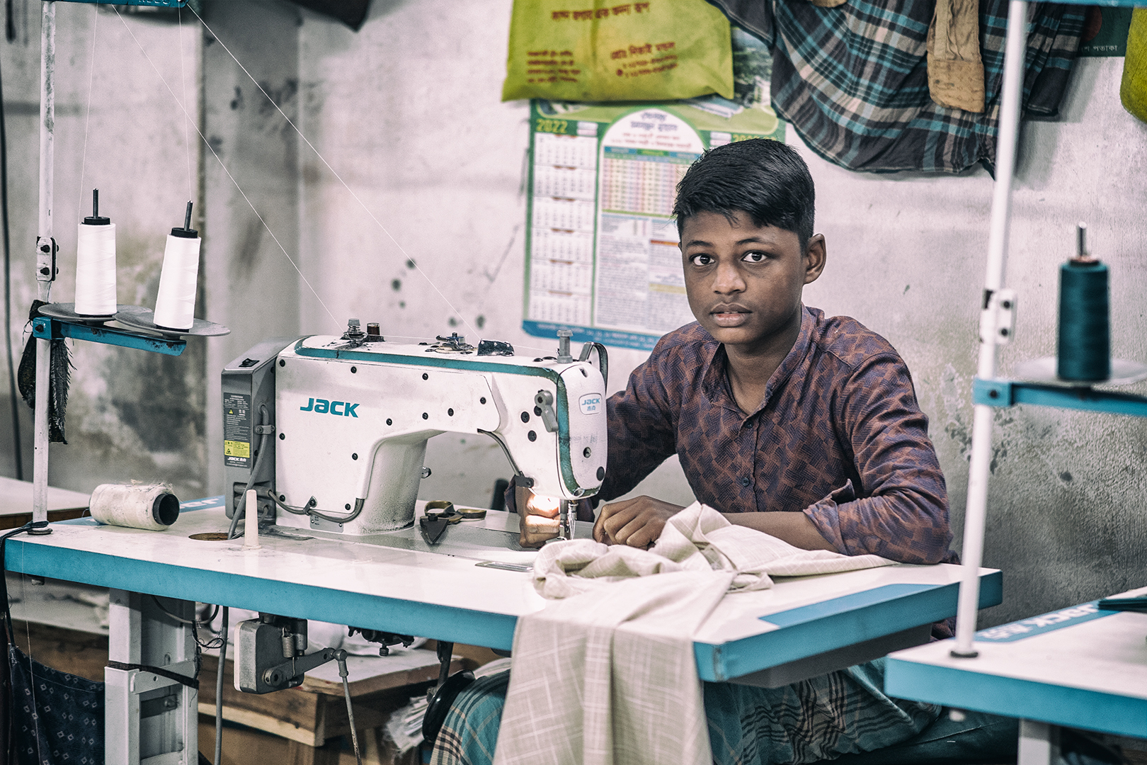 Vyrážame teda hore po schodoch. Na prvom poschodí sú predajne. Na druhom sa odevy balia. Na treťom … nakukujem do prvých dverí. Násťročný chlapci za šijacími strojmi. Odpájam sa od skupiny. Oldřiška a Viktor rovnako. Fotíme, chlapci neprotestujú. Presúvame sa do ďalšej miestnosti. Tu ešte podaktorí spia. Iní sa venujú rannej hygiene.