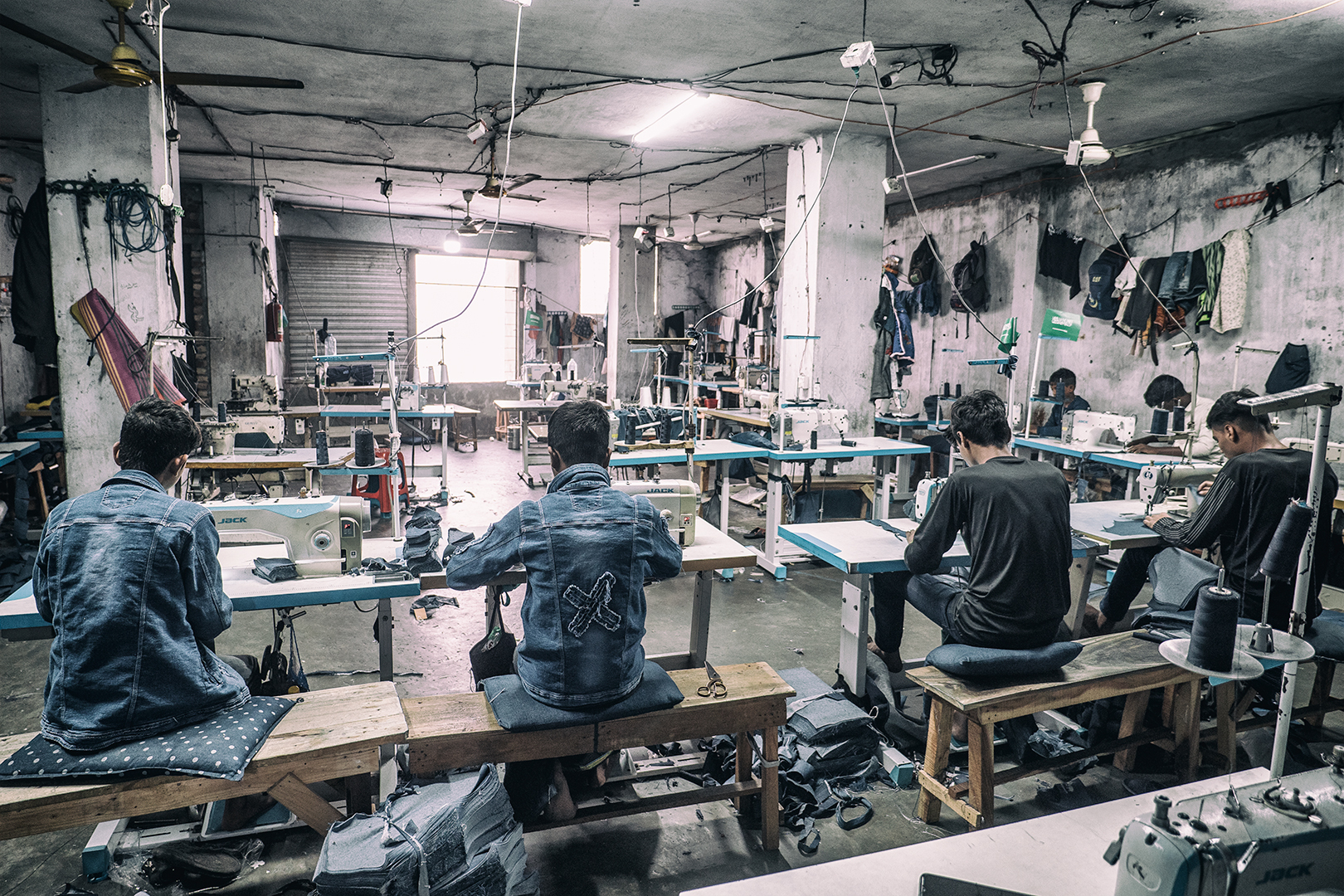 Dlhé chodby, jedna nevetraná miestnosť za druhou. Osvetlenie len poväčšinou len umelé. Tak tu vznikajú značkové odevy. Dole na prízemí sa rifle predávajú 5 dolárov za kus. Bez ohľadu na značku. V „značkovom supermarkete“ v meste za 10. U nás …