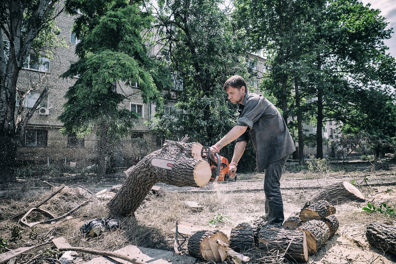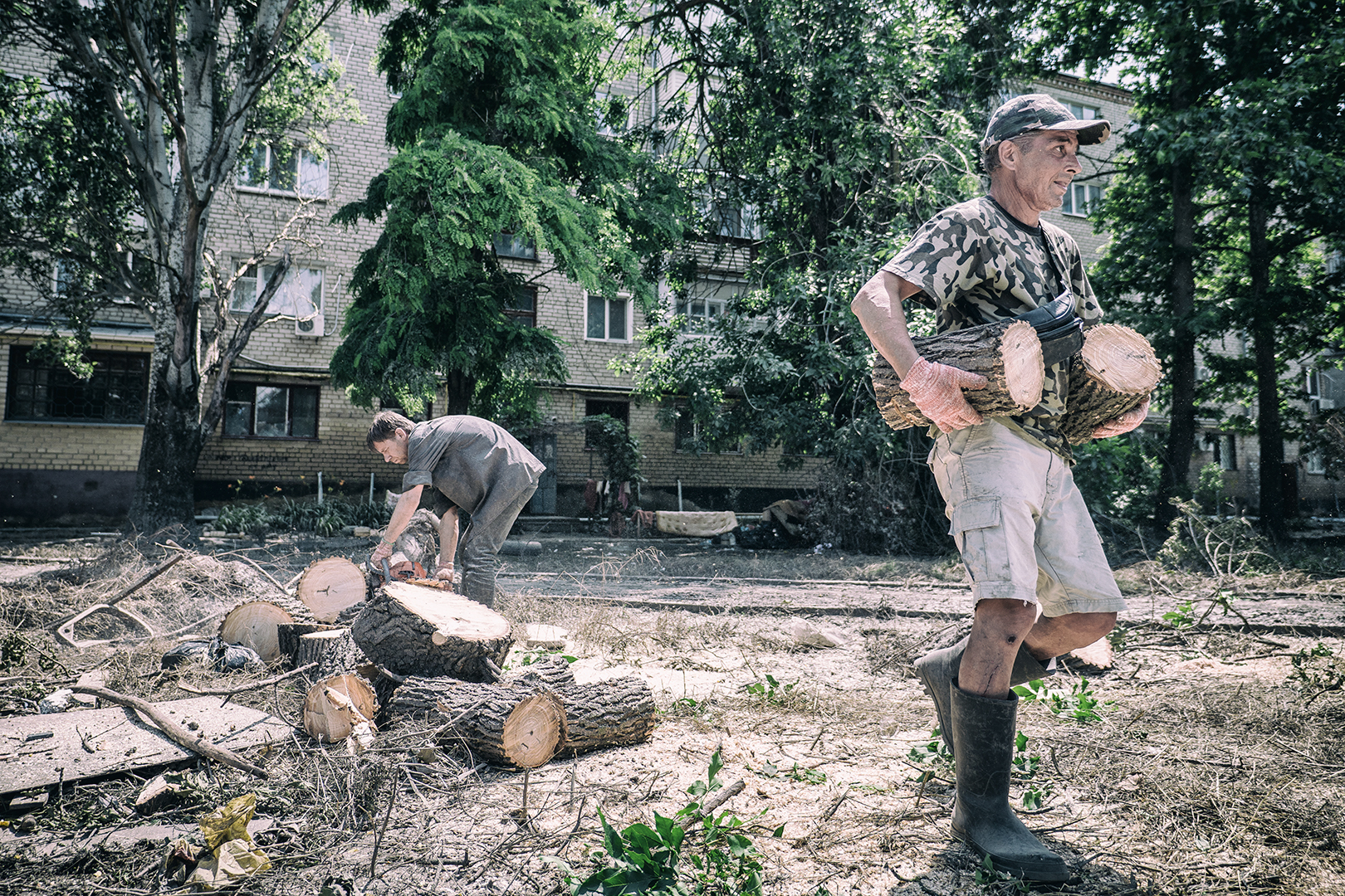 V Chersone sú štyri univerzity. Pred vojnou mal 300 tisíc obyvateľov. Po okupácii ich ostalo 30 tisíc. Koľko ostalo po záplavách si netrúfa nikto odhadnúť. Alexander so synom pília na ulici mesta stromy. „Spravili sme si v panelákovom byte piecku – buržujku. So starej palivovej nádrže z auta. Komín sme vybúrali cez stenu,“ vysvetľuje mi počas krátkej pauzy. „Chystáme drevo na zimu. Manželka je chorá a nemáme kam odísť. Nemáme vodu, nemáme elektriku. Ale aspoň nemrzneme. Len komáre nás teraz žerú,“ dodáva