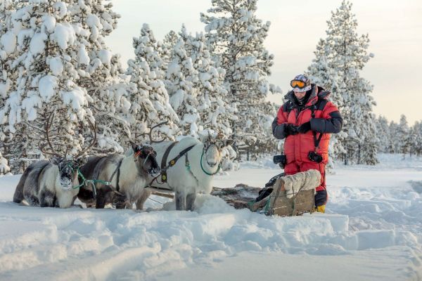 Vyrazili sme ráno za stádom sobov. Romantická ranná jazda pri teplote -35°C. Cestou sme sa raz vykotili keď som sa pokúsil „šoférovať“ sane sám. Na veľkú zábavu našich sprievodcov. Keď sme sa konečne priblížili k stádu, došlo k neplánovanému čelnému stretu, soby zahli dopravaa s dunením kopýt zmysli v poraste. Paťo stihol čosi nafotiť. Ja som sedel chrbtom do smeru jazdy – fotil som v rannom slnku sane za mnou.