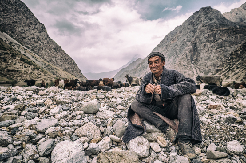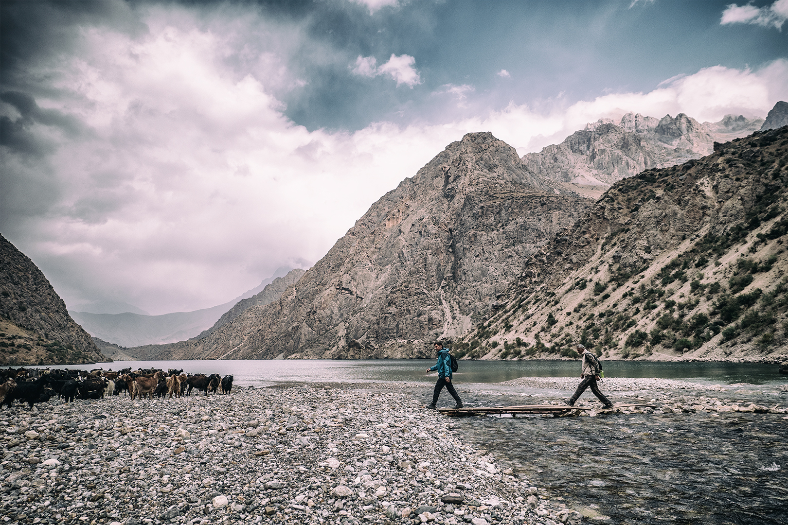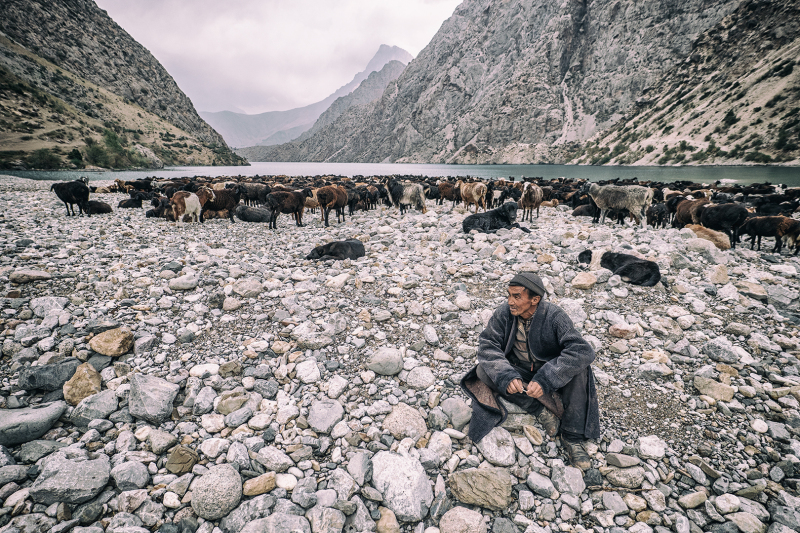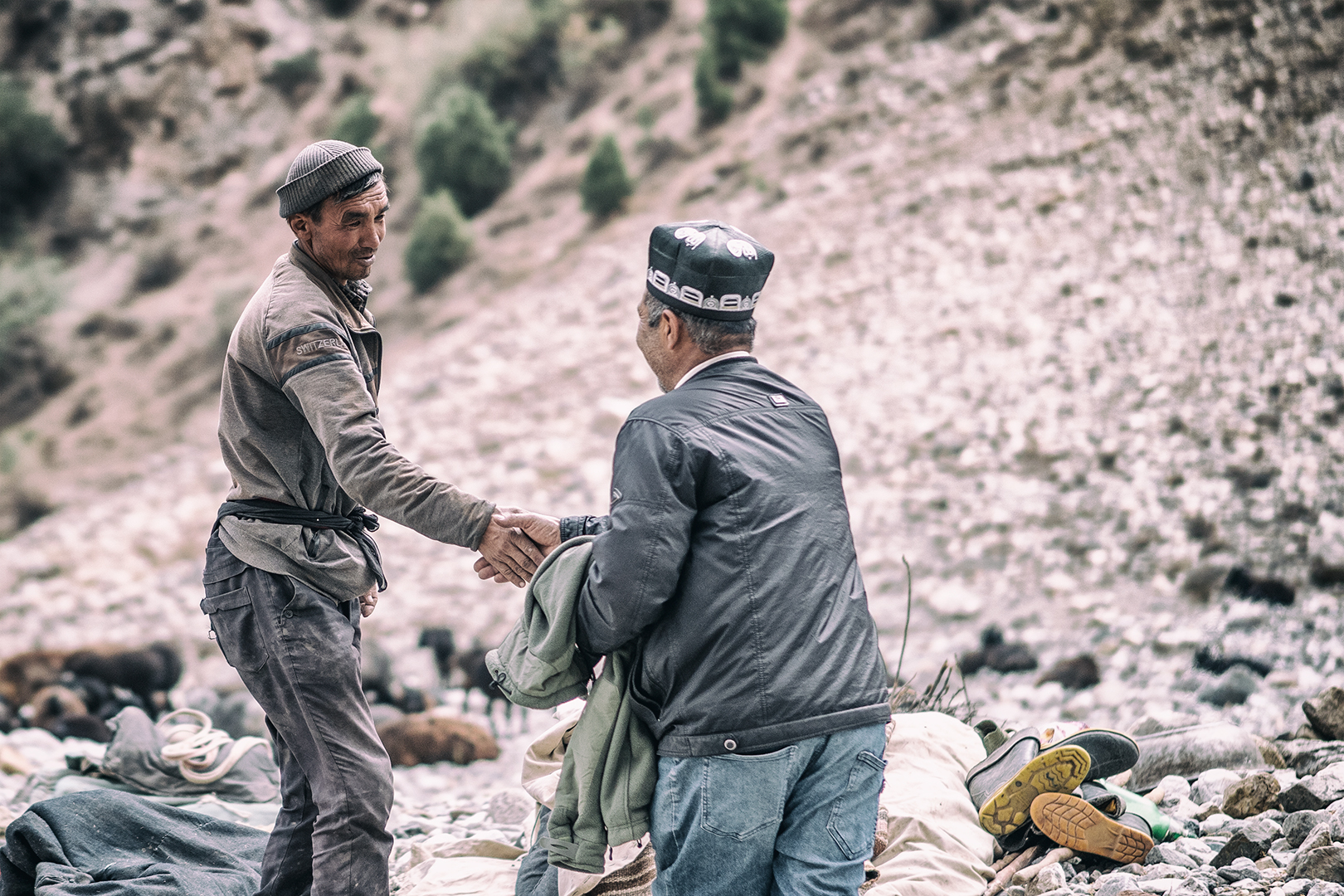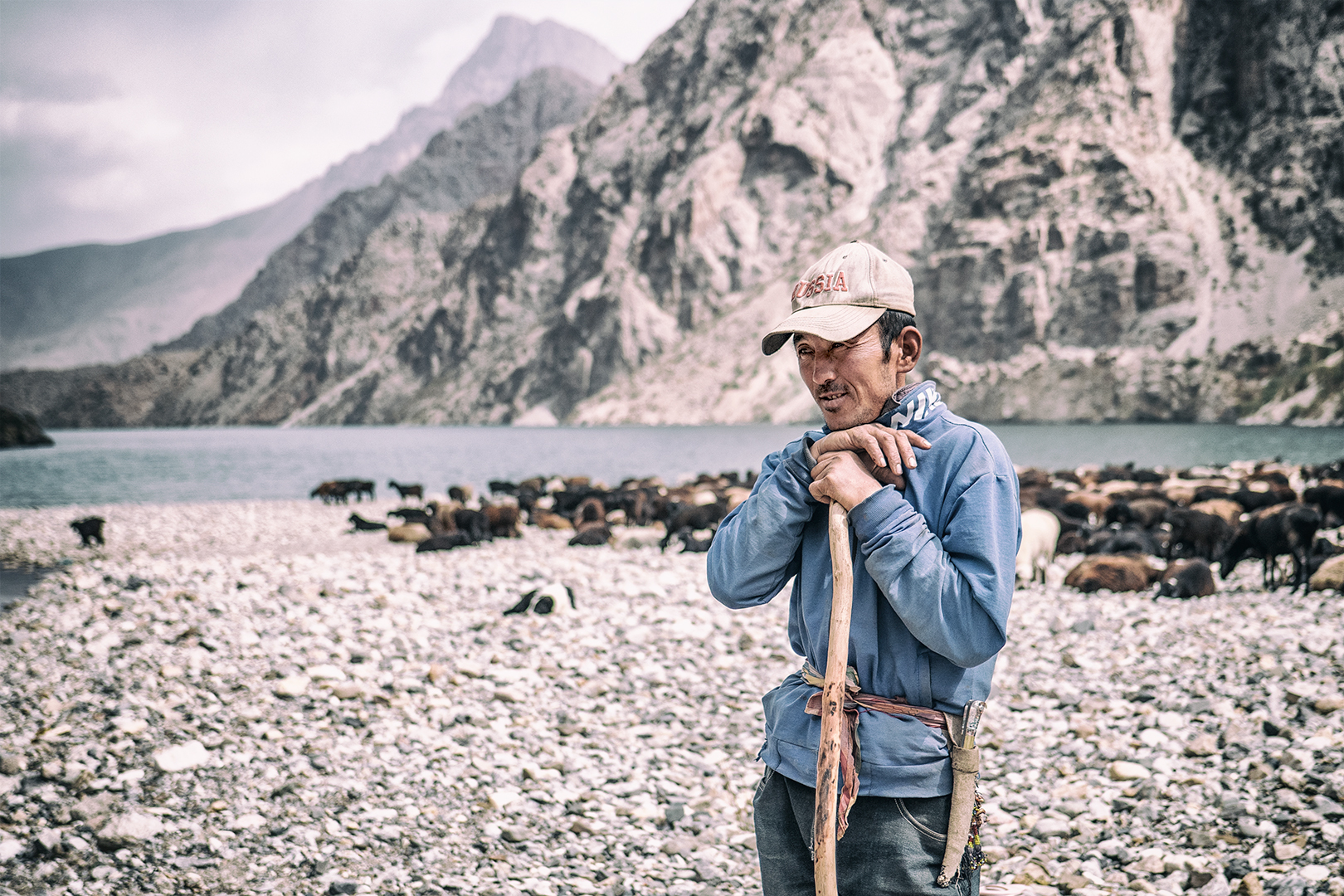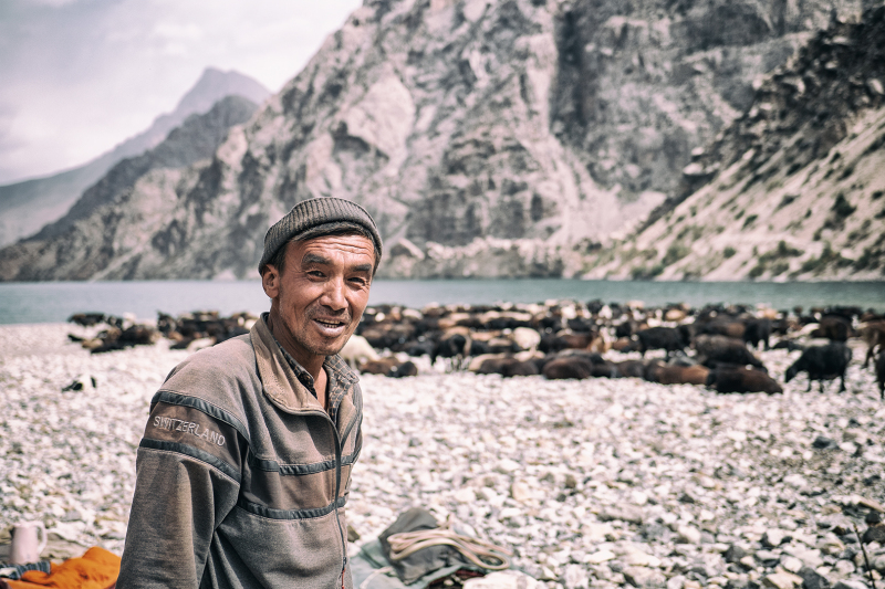 Pri Siedmom jazere cesta končí. Odstavujeme náš Nissan a pokračujeme ďalej po úzkom chodníčku vinúcom sa popri brehu jazera. Jumaboy nasadzuje naozaj rezké tempo a hneď po štarte stretáme rodinku vedúcu osly naložené senom. Skúšame niečo odfotiť, ale na úzkom chodníčku je problém sa vôbec vyhnúť a nie ešte nájsť priestor na fotenie. Po asi pol hodine chôdze sa dostáva k južnému koncu jazera. Pri ústí riečky vlievajúcej sa jazera táborí skupina pastierov so stádom oviec. Ako sa približujeme, od stáda sa oddelí pes. Chvost má stiahnutý. Jumaboy berie do ruky kameň, ja sa pridávam. Našťastie si psa všimne jeden z pastierov a zaženie ho. Pastieri sa zdravia s našim sprievodcom. Ten sa ich pýta či je niekto hore v dedine. Vraj len jedna rodina.