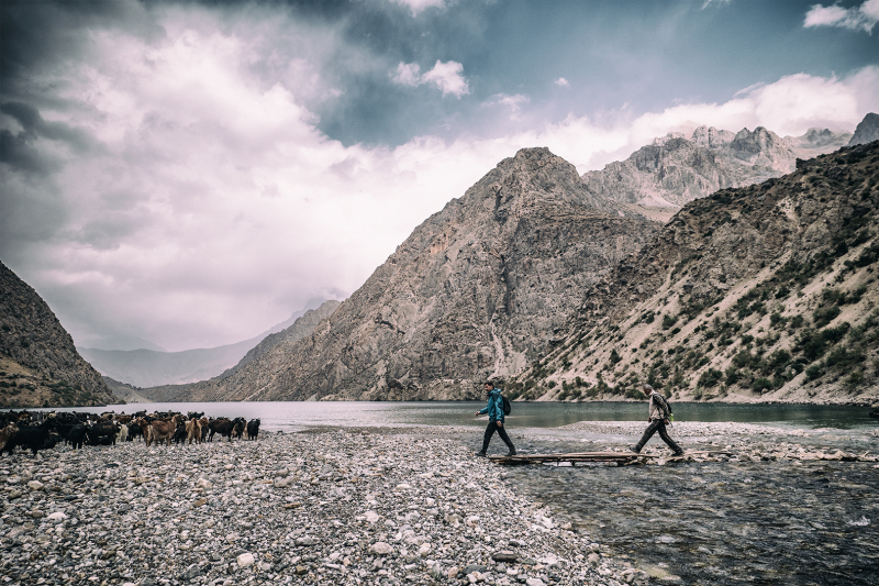Znovu sa dávame na pochod. Terén sa zažína dvíhať. Kráčam s Jumaboyom, rozpráva mi o tom ako kedysi hore týmto údolím vodil turistov z tábora pri Štvrtom jazere. Hore vo výške cez 4000 metrov je priesmyk a za nim sa nachádza Saratog a jazero Iskanderkul, kde sme boli pred dvoma dňami. Je to cesta na niekoľko dní. Popisuje mi ďalšie možnosti trás ale už sa strácam v názvoch. Registrujem len keď mi vraví, že za necelých 20 dní by sme došli peši do Dušanbe. No ďakujem pekne. Jumaboy má zvláštny spôsob chôdze. Robí krátke kroky na veľmi vysokej frekvencii a takmer vôbec pri chôdzi nepohybuje rukami. Na pomerne rovnej ceste popri jazere nasadil dosť vysoké tempo, ale celá skupina celkom v pohode stíhala. Teraz vyráža úplne rovnakým tempom do kopca. Držím sa tesne za ním. Po chvíli zisťujem, že sme sami. Pozriem cez plece a ostatní zaostávajú pár desiatok metrov. Jumaboy trieli predo mnou a rozpráva a rozpráva, bez toho aby sa zadýchal. Upozorňujem ho, že ostatní sú ďalej za nami. „Nevadí, neskôr ich počkáme“, odvetí. „A nemôžeme ísť pomalšie?“ pýtam sa. „Nie kvôli sebe, ale kvôli ostatným“, dodávam aby som nebol za padavku. „Keď idem pomaly, som neskôr v cieli a viac sa unavím“, odpovedá. Nuž na to nie je argument. Cválam teda za Jumaboyom, sem tam mrknem na Garminy. Tep mám zatiaľ pod 120 tak je to dobré. Cesta sa zdvíha, začínam búchať 140. Jumaboy sa sem tam obzrie cez plece. Vždy nahodím úsmev akože úplne nič a takýmto tempom chodím ráno pre mlieko. Konečne sa objavujú kamenné domčeky nalepené v svahu oproti. Musíme si ale riadne nadbehnúť hore údolím, aby sme sa dostali k mostíku cez riečku. Tu čakáme ostatných. Len čo dorazia, Jumaboy ako správny vodca vyrazí. Veď my sme sa už vydýchali.