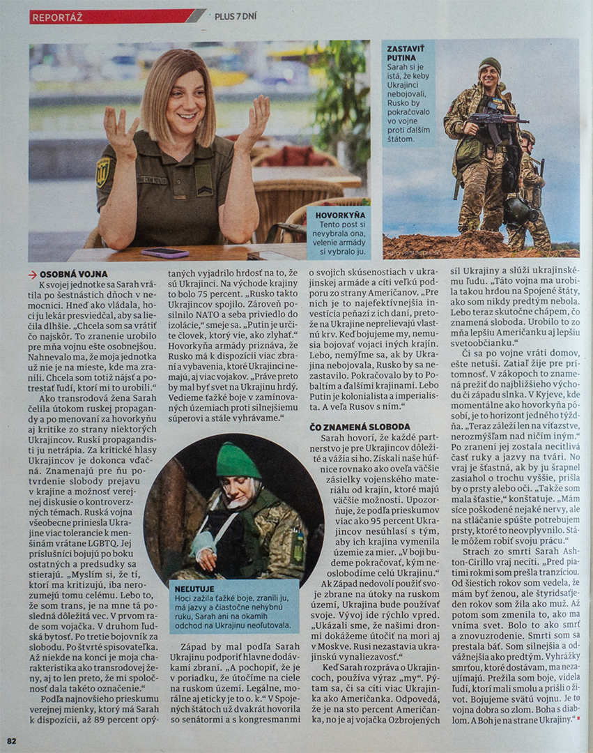 Hovorkyňou Ozbrojených síl Ukrajiny je transrodová Američanka SARAH ASHTON – CIRILLO. Na Ukrajinu prišla ako novinárka, no videla toľko ruských vojnových zločinov, že chcela urobiť viac. Tak vstúpila do armády.